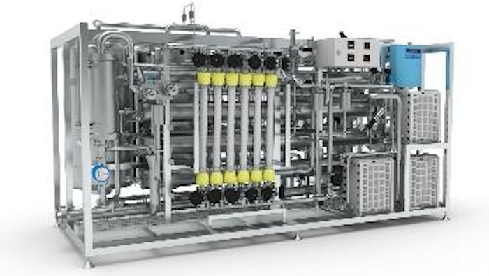 The PW generator, which Vetter uses to feed the distillation systems for WFI processing and to clean, for example, format parts and syringe bodies before autoclaving, has a capacity of 10,000 liters per hour and includes several process stages. First, the potable water is softened in an ion exchanger. Reverse osmosis is used to reduce the ion content of the softened water and retain the majority of germs and endotoxins. The CO2 content is then reduced by membrane degassing, followed by electrodeionization and ultrafiltration to remove residual ions, germs, and endotoxins. The entire system can be sanitized with hot water.